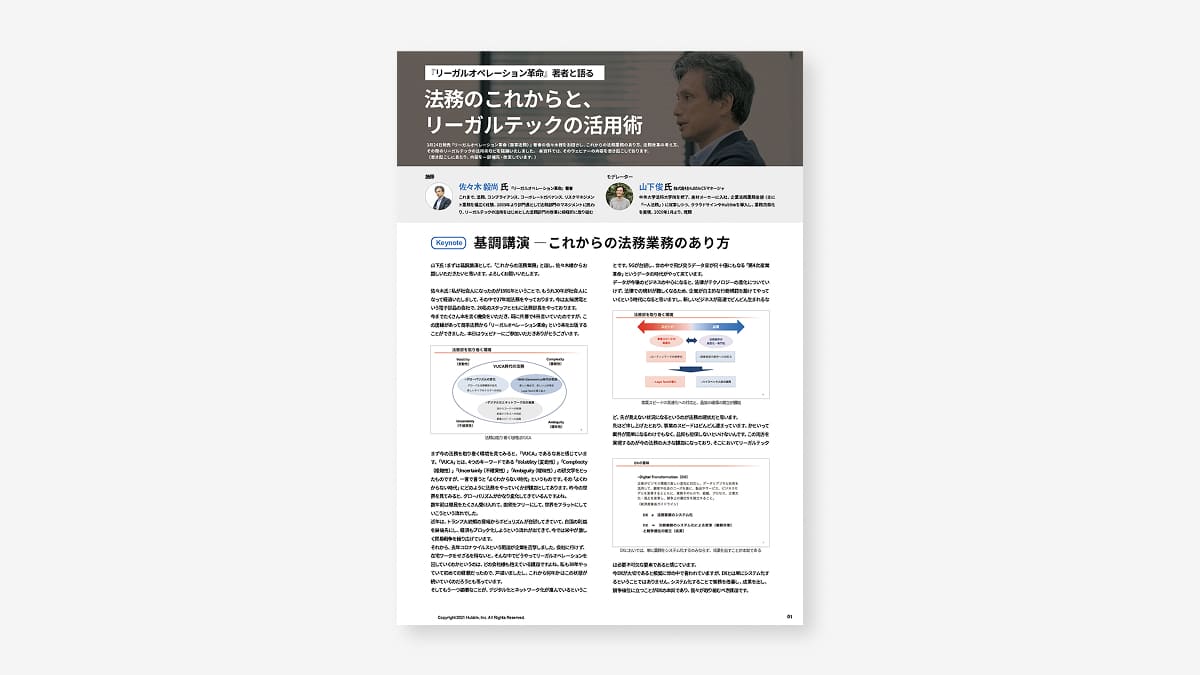 本資料では佐々木氏をお招きし、これからの法務業務のあり方、法務改革の考え方、その際のリーガルテックの活用術などを議論したウェビナー内容を書き起こし、これらについて詳細に解説しています。