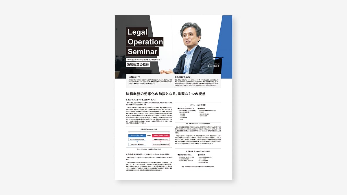 法務業務の改善についての具体的なTipsや事例が紹介されています。法務部長を歴任してきた佐々木様が考える法務改革の指針は必見です。